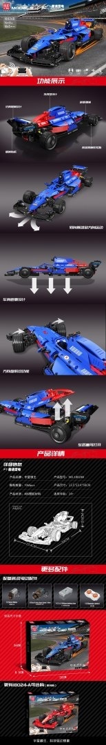 Wysokiej jakości klocki konstrukcyjne dla dzieci od czternastego roku życia. Zestaw składa się z 1065 elementów, z których zbudować można zdalnie sterowany Bolid F1. Pojazd jeździ we wszystkich kierunkach do przodu, do tyłu w prawo i w lewo. Sterować go można za pomocą pilota dołączonego do zestawu lub przy pomocy aplikacji w telefonie. Aplikację można pobrać skanując kod QR znajdujący się na opakowaniu. Dzięki aplikacji można nie tylko poruszać pojazdem, ale również zaprojektować jego ruchy. Posiada gumowe opony, które zapewniają mu dobrą przyczepność do podłoża. Auto zasilane jest akumulatorem 7,4V (znajduje się w zestawie), pilot bateriami typu 2 x AAA 1,5V (brak w zestawie).